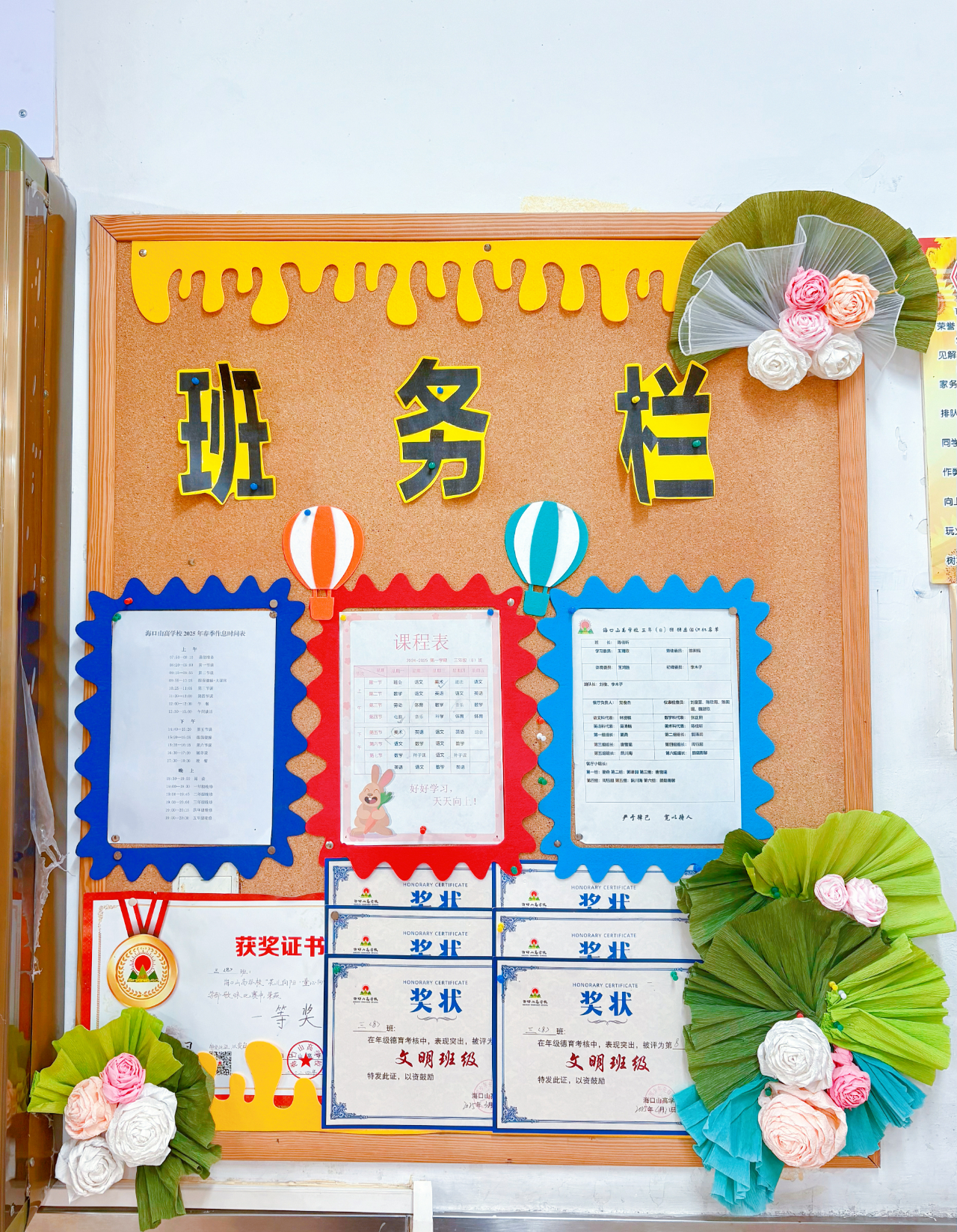 ? ? ?文化墻布置:設(shè)置“海南本土文化”的文化墻,我們班的班級文化墻主要是圍繞海南文昌的本土文化進(jìn)行設(shè)計(jì),展示同學(xué)們以文昌的美食,文昌的景物繪畫的手抄報(bào)和班級同學(xué)的生活照片和班級推薦書目,為同學(xué)們提供展示自我的平臺(tái),激發(fā)大家的創(chuàng)作熱情。同時(shí),文化墻上還有“成長足跡”板塊,記錄同學(xué)們在學(xué)校的點(diǎn)滴進(jìn)步和重要活動(dòng)瞬間,增強(qiáng)班級凝聚力和同學(xué)們的歸屬感。