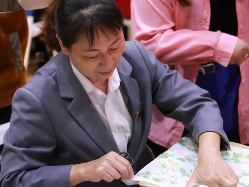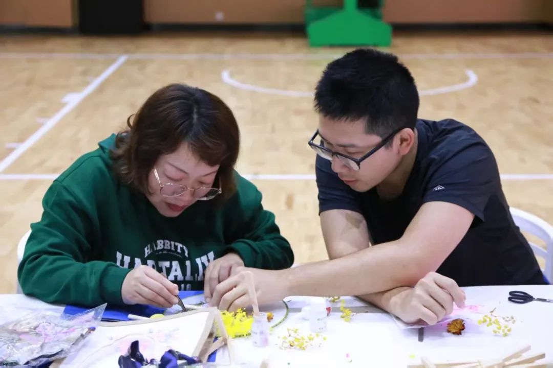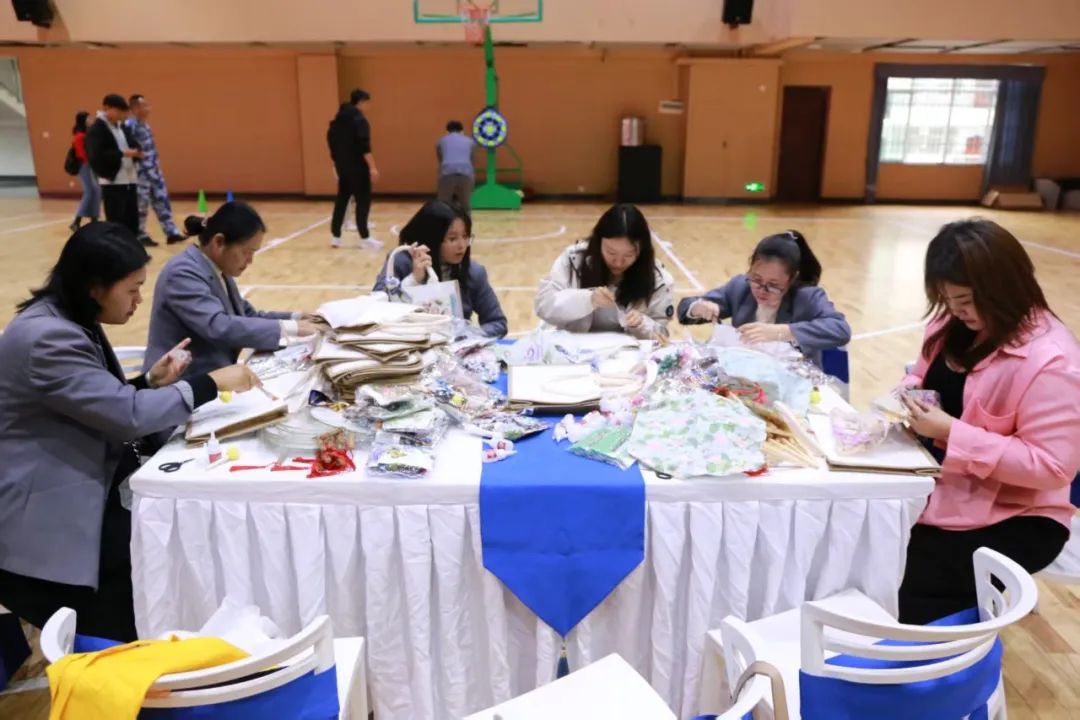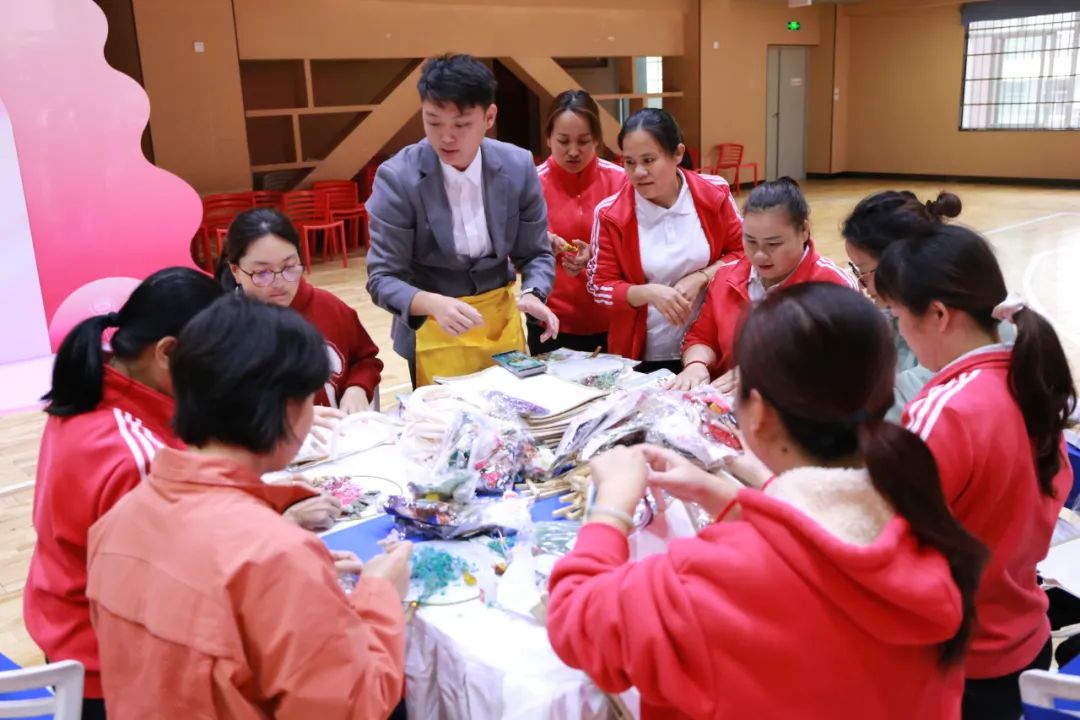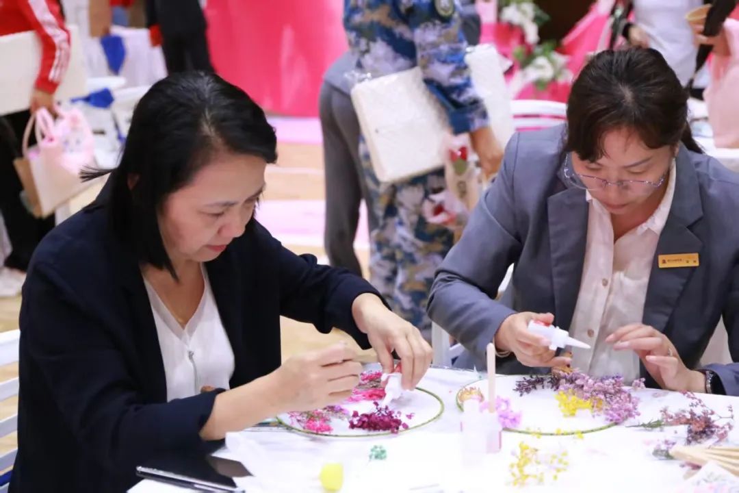 女教職工們簇?fù)矶?,?xì)心制作永生花團扇、花燈、手工包等,體驗手工樂趣,展現(xiàn)藝術(shù)風(fēng)采。